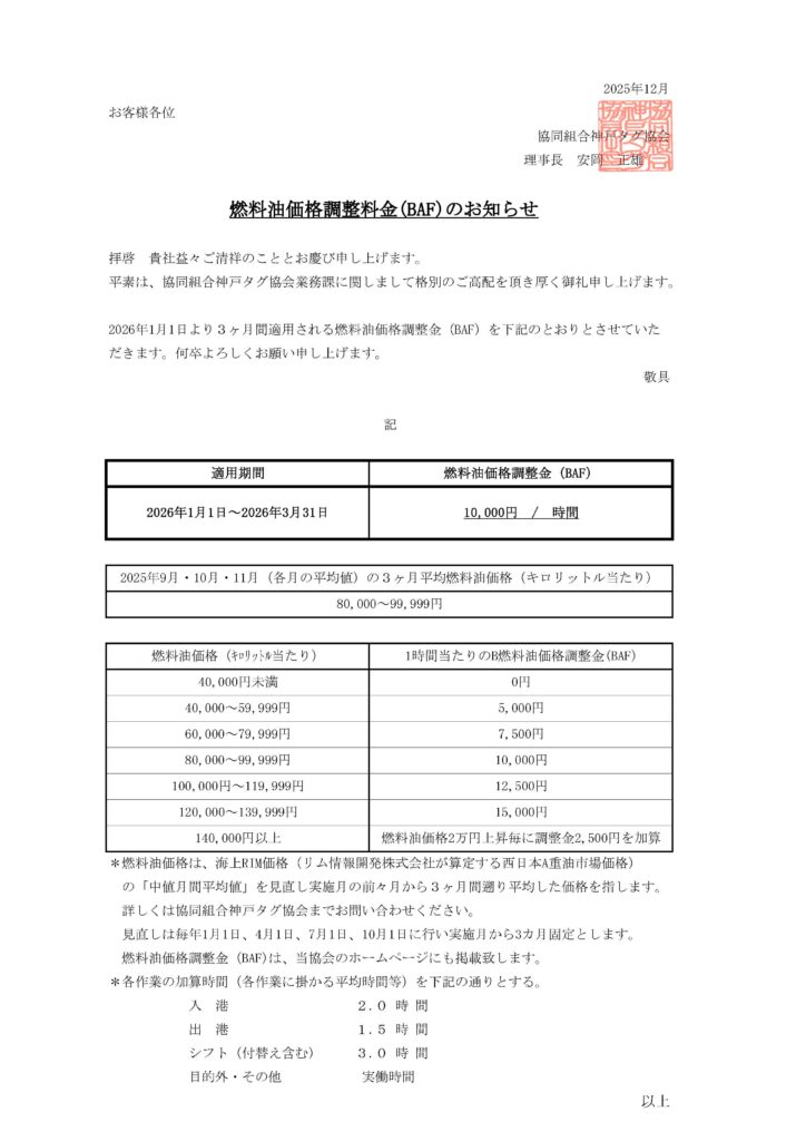 2026年1月1日〜3月31日までの燃料油価格調整金額(BAF)決定のお知らせ 2025 12/08 ニュース 2025年12月8日 印刷用PDFはこちら→ 印刷用PDF(英語版)はこちら→ ニュース 2025年10月1日〜12月31日までの燃料油価格調整金額(BAF)決定のお知らせ 関連記事 2025年10月1日〜12月31日までの燃料油価格調整金額(BAF)決定のお知らせ 2025年9月3日 2025年7月1日〜9月30日までの燃料油価格調整金額(BAF)決定のお知らせ 2025年6月16日 役員変更のお知らせ 2025年6月12日 2025年4月1日〜6月30日までの燃料油価格調整金額(BAF)決定のお知らせ 2025年3月7日 新年あけましておめでとうございます 2025年1月1日 2025年1月1日〜3月31日までの燃料油価格調整金額(BAF)決定のお知らせ 2024年12月9日 2024年10月1日〜12月31日までの燃料油価格調整金額(BAF)決定のお知らせ 2024年9月11日 2024年7月1日〜9月30日までの燃料油価格調整金額(BAF)決定のお知らせ 2024年6月6日